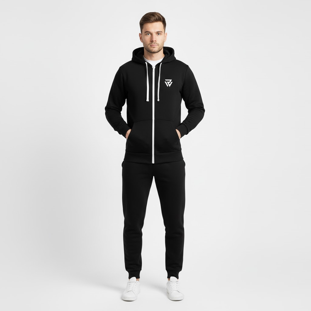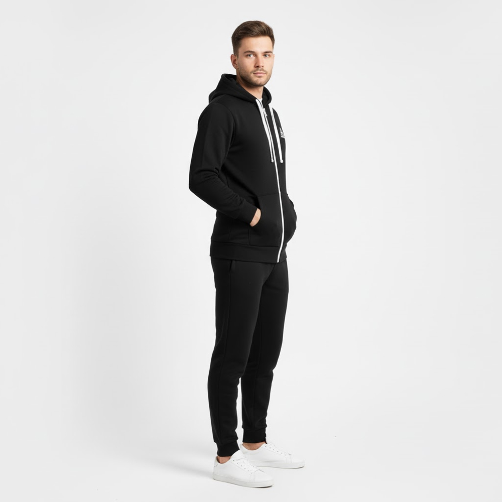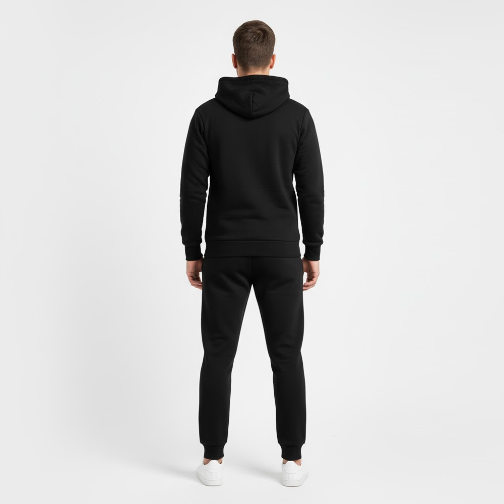 Men’s Custom Black Tracksuit Set — Zipper Hoodie & Jogger Pants, Streetwear Sportswear for Autumn/Winter